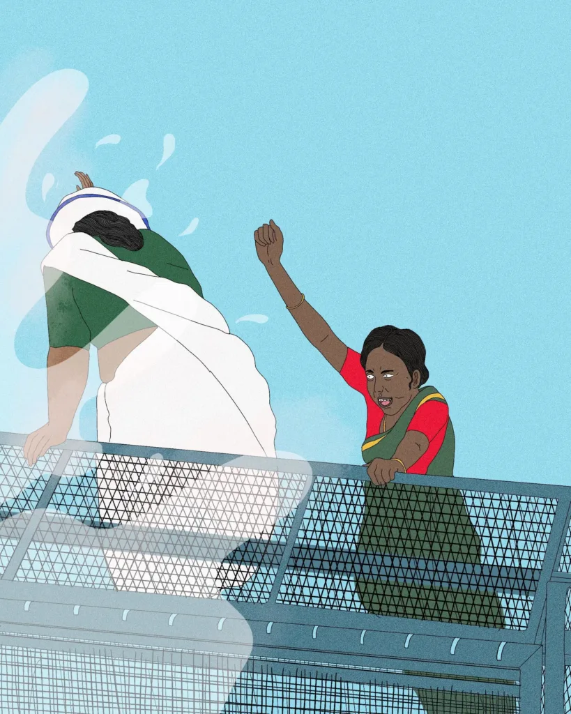 Anger rippled through the assembled workers. The journalist felt like a symbol of the system that refused to engage with the group meaningfully, even indulging in character assassination of some of the leaders of KAHWA. One of these leaders is Mini Chechi, a prominent face at the strike site. She calmly picked up the mic.