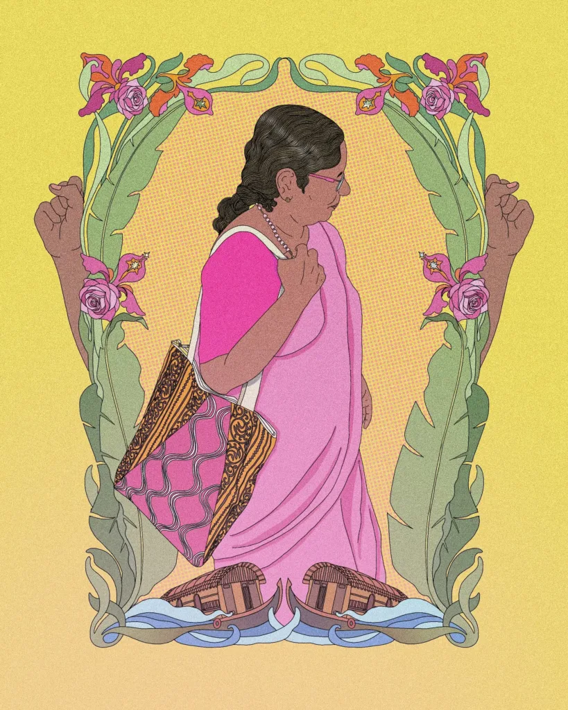 Our protagonist is a leader who emerged during this strike, like many others. Her name is Rosamma. One walk through her town with her, and like every other person who passes by and stops to talk, you might start calling her “Rosamma Chechi” too.
