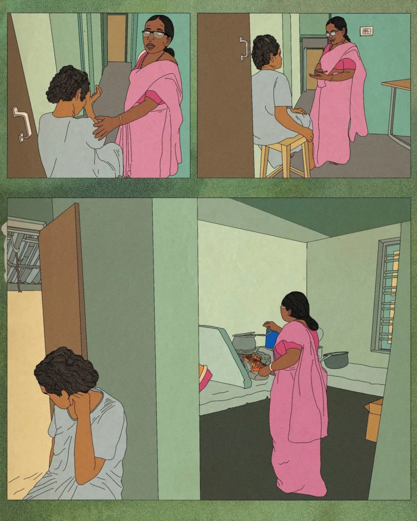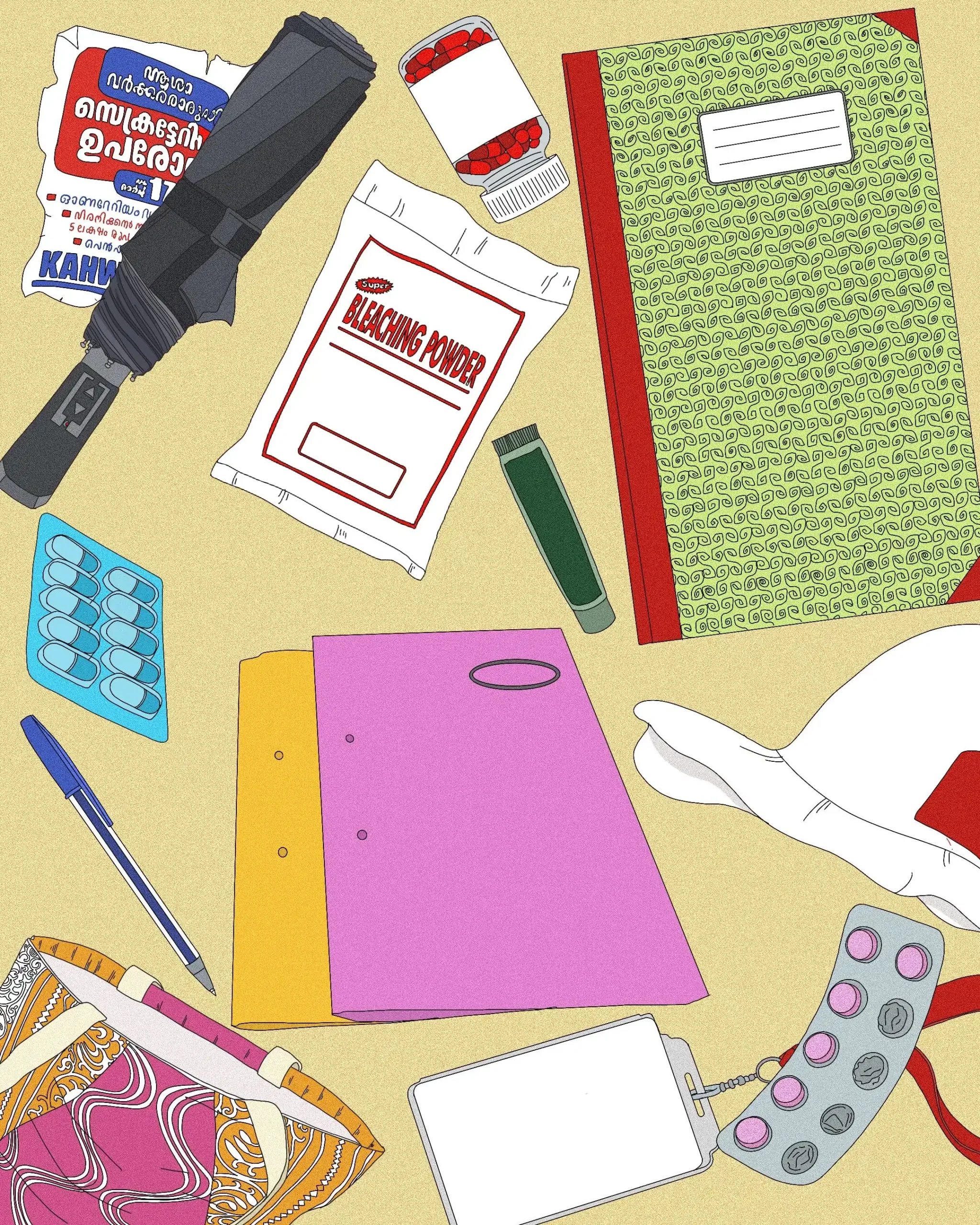Yashoda seemed to ignore her, distracted, almost like it was her only escape from Chechi’s questions. From the kitchen, Chechi made her way into Yashoda’s bedroom, asking one question after the other, and finally emerged with a polythene bag. She fished out a diary and a paper bag of tablets, and gave a loud gasp.